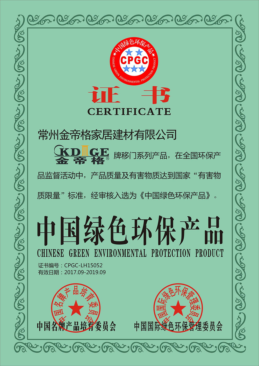 金帝格移門榮獲“綠色環(huán)保首選產(chǎn)品”